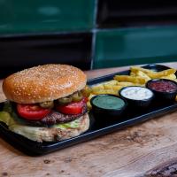 یک عدد برگر دست ساز گوشت گوساله ۱۵۰ گرمی، سس مخصوص، هالوپینو، گوجه، کاهو، نان مخصوص،فینگر سیب زمینی سرخ شده