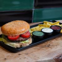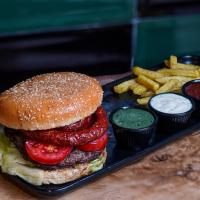 یک عدد برگر دست ساز گوشت گوساله ۱۵۰ گرمی، سس مخصوص، گوجه، کاهو، نان مخصوص