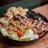 یک نفره، ۱۵۰ گرم سینه مرغ گریل، کاهو، زیتون، نان سیر، گوجه گیلاسی، پنیر پارمسان، به همراه یک عدد سس سزار دست ساز یک نفره