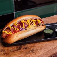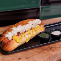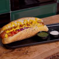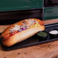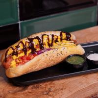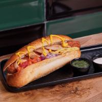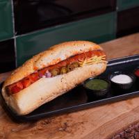 یک عدد سوسیس هات داگ گوشت ۹۰%، هالوپینو، سس تند، گوجه، خیارشور، کلم، چیپس خلال، نان به انتخاب شما