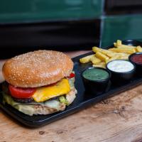 یک عدد برگر دست ساز گوشت گوساله ۲۰۰ گرمی سس مخصوص، یک ورق پنیر گودا، گوجه، کاهو، نان مخصوص، فینگر سیب زمینی رایگان