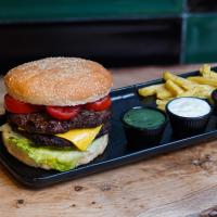 ۲ عدد برگر دست ساز گوشت گوساله ۳۰۰ گرمی، سس مخصوص، یک ورق پنیر گودا، گوجه، کاهو، نان مخصوص، فینگر سیب زمینی رایگان
