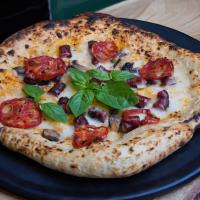 خمیر پیتزا ناپولیتن، سوسیس چوریتسو گوشت ۹۰%، سس مارینارا، قارچ، پنیر ناپولی، گوجه یا ریحان ایتالیایی یا روکولا