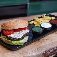 یک عدد برگر دست ساز گوشت گوساله ۱۵۰ گرمی، سوسیس چوریتسو، سس مخصوص، گوجه، کاهو، نان مخصوص، سیب زمینی سرخ شده